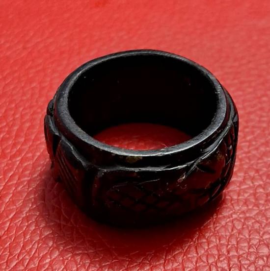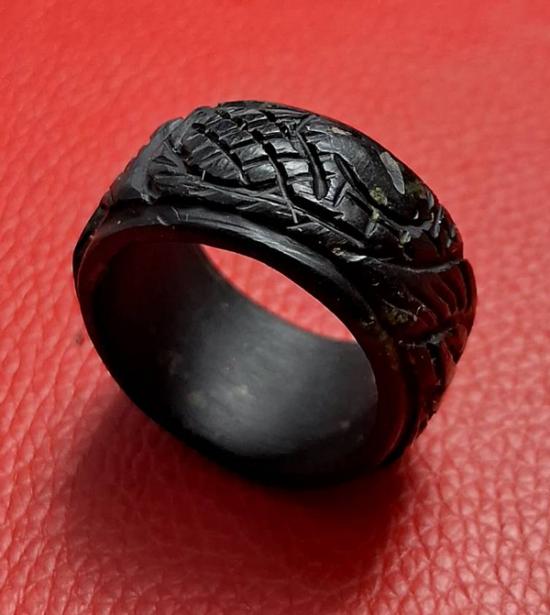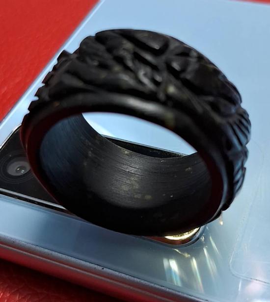 แหวนหยกดำแกะลายมังกร หยกพม่าแท้ 100 % (แสงส่องผ่าน) เส้นผ่าศูนย์กลาง 2.2 ซม. หนา 1.5 ซม. หายากวงใหญ่ๆ ไม่ค่อยได้มาบ่อย ราคาค่อนข้างสูง (กท.23)