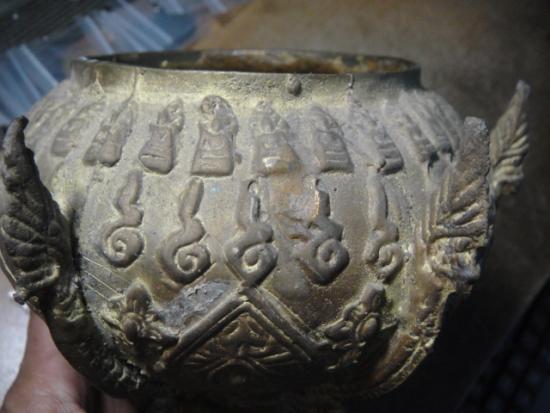 ชื่อพระเครื่อง ขันน้ำมนต์นพเกล้า เนื้อทองผสมหล่อ ขนาดความกว้าง 3.5 นิ้ว สูง 11 นิ้ว พิธีใหญ่ 25 พุทธศตวรรษ ปี 2500 พระเกจิอาจารย์108 รูปทั่วประเทศปลุกเสก