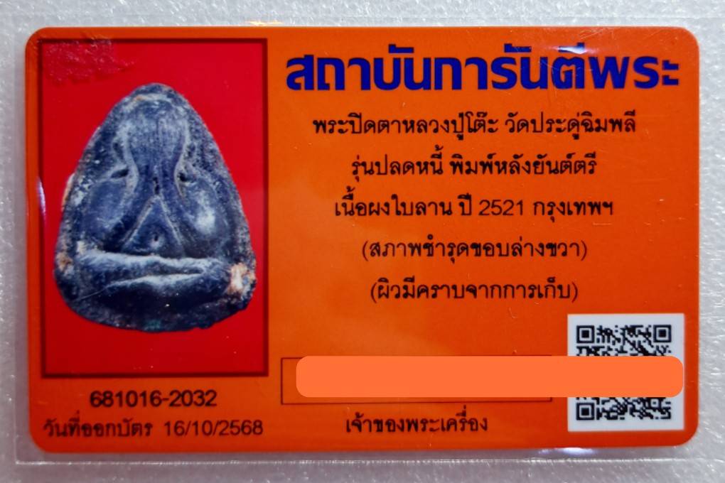 ปิดตาปลดหนี้หลังยันต์ตรีหลวงปู่โต๊ะวัดประดู่ฉิมพลีปี2521ติดรางวัลที่2งานเซียร์รังสิตและบัตรรับรองท่านใดอยากมีไว้ขึ้นคอแนะนำองค์นี้เลยองค์พระสวยนิ้วมือเป็นริ้วสวยงามเนื้อจัดจ้านตลับอิตาลี่พร้อมขึ้นคอค๊ะ