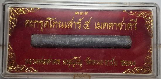 ตะกรุดโทนเสาร์ 5 เมตตาชาตรี เป็นตะกรุดที่อุดผงพรายกุมาร ผงพุทธคุณต่างๆ และผงกรุพระรอดลำพูน ที่ตำบดละเอียดใส่ไว้ในตะกรุดปิดหัวท้ายด้วยเทียนชัยพุทธาภิเษก โดยหลวงพ่อสาคร นั่งปรกอธิฐานจิตปลุกเสกบนหอยันต์ วัดหนองกรับ 9 วัน ถึงวันเสาร์แรม 5 ค่ำเดือน 5 นับเป็นตะกรุดอันทรงคุณค่าของหลวงพ่อสาคร อีกรุ่นหนึ่ง ที่หลวงพ่อได้บรรจงจัดสร้างขึ้นตามตำรับโบราณคณาจารย์สายหลวงปู่ทิม วัดละหารไร่.....ตัวตะกรุดลงพระคาถาทางเมตตาชาตรี ซึ่งปกติพระคาถาที่นำมาลงในตะกรุดรุ่นนี้ เป็นคาถามหาอุด แต่หลวงพ่อได้นำมาถอดพระคาถา 5 ตัว ให้ครบ 30 ตัว เพื่อเพิ่มพลังทางด้านเมตตาเสริมเข้าไป กลายเป็นเน้นทางเมตตา แคล้วคลาดภยันตรายต่างๆ ซึ่งใช้เวลานานในการถอดสูตรเป็นพิเศษ กว่าจะสำเร็จจนเกิดเป็นตะกรุดเมตตาชาตรีนี้ ซึ่งดีพร้อมทุกๆ ด้าน ขนาดความยาวประมาณ 3 นิ้ว เนื้อตะกั่ว จารมือ ตอกโค้ดดอกจันทร์หัวท้าย 2 ด้าน และโค้ดตัวอุใหญ่ |