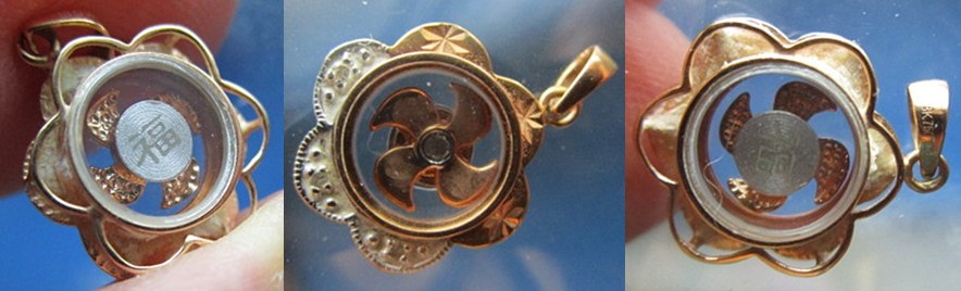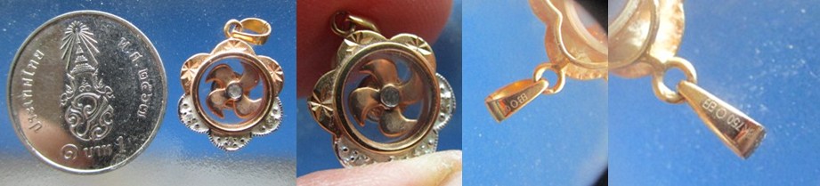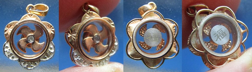 ชื่อพระเครื่อง จี้ห้อยคอกังหัน ทอง 18 k มีเพชรแท้เม็ดเล็กๆ 3 เม็ด ในกังหันอีกเม็ด ซื้อจากร้านจิวเวอรี่ที่ฮ่องกง นน. รวม 1.42 กรัม กังหันหมุนเปนโชคลาภครับ มือสองสภาพดีมาก กังหันหมุนวิ้วไหลลื่น ..ตอก 18k