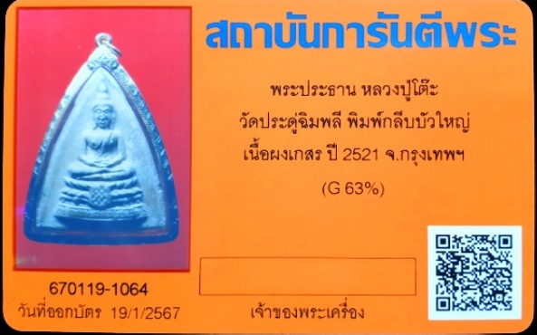 พระประธาน หลวงปู่โต๊ะ วัดประดู่ฉิมพลี พิมพ์กลีบบัวให่ เนื้อผงเกสร ปี2521 เลี่ยมทอง63%+บัตร