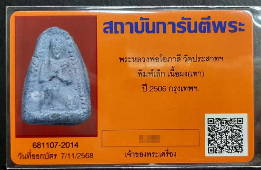 หลวงพ่อโอภาสี วัดประสาทฯ พิมพ์เล็ก เนื้อผง(เทา) ปี2506 กทม. พร้อมบัตรรับรองครับ