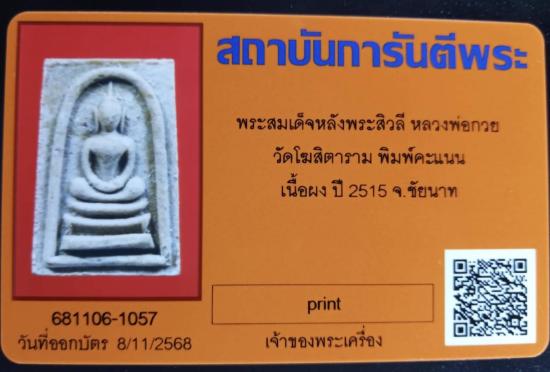 พระสมเด็จหลังพระสิวลี หลวงพ่อกวย วัดโฆสิตาราม จ.ชัยนาท ปี ๒๕๑๕ พิมพ์เล็ก เนื้อผง (นิยม) (หลังยันต์แถวเดียว) (พร้อมบัตรรับรองครับ)