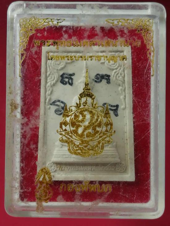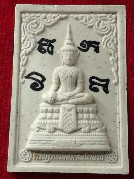 พระพุทธเมตตาเสนานาถ เนื้อผงพุทธคุณสีขาววัดพระศรีรัตนศาสดาราม (วัดพระแก้ว) จัดสร้างโดย กองทัพบก ปี ๒๕๔๔ พร้อมกล่อง มีจาร 3 ด้าน เคาะแรกถึงขั้นต่ำครับ LINE ID : sumsawang