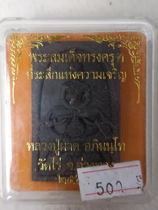 พระสมเด็จทรงครุฑ หลวงปู่ผาด วัดไร่ ปี 2554 เนื้อว่านกากยายักษ์ ฝังเม็ดแร่ขวานฟ้า และพระธาตุ มีเส้นเกษาหลวงปู่ผาด โรยด้านหน้า