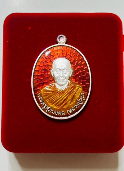 วัดใจ เหรียญ 8 รอบ ศุภมงคล หลวงปู่หุน วัดบางผึ้ง จ.ฉะเชิ่งเทรา เนื้อเงินลงยาแดง เลข62