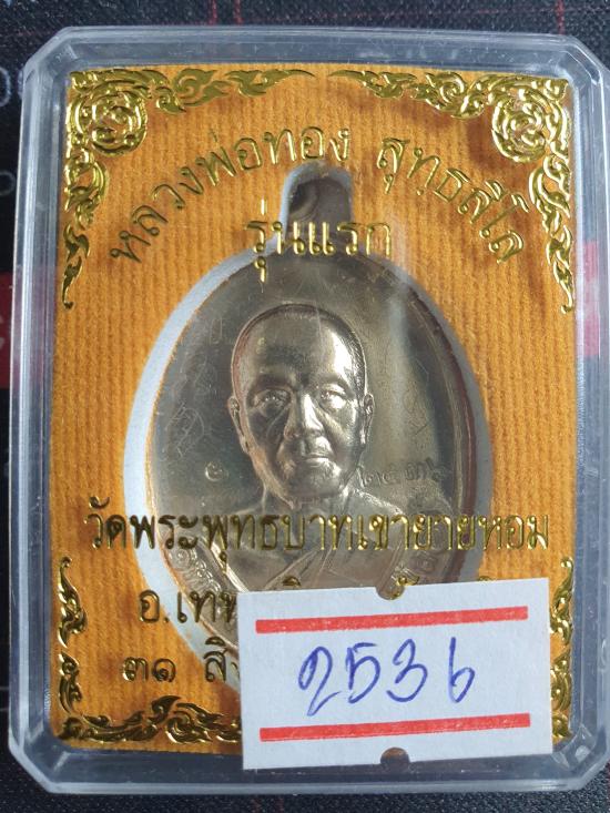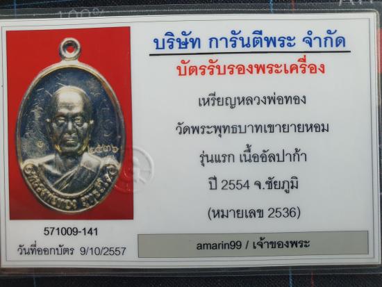 เหรียญรุ่นแรก หลวงพ่อทอง วัดบ้านไร่ หลังยันต์แปด ออกวัดพระพุทธบาทเขายายหอม เมื่อปี 2554 เนื้ออัลปาก้า หมายเลข 2536 จารหน้าหลัง สภาพสวยมาก พร้อมบัตรรับรอง