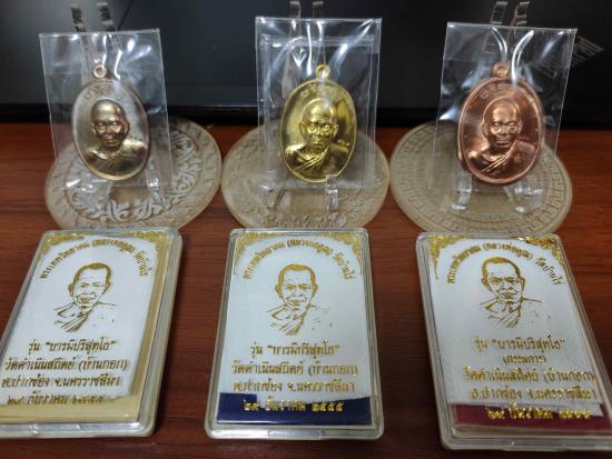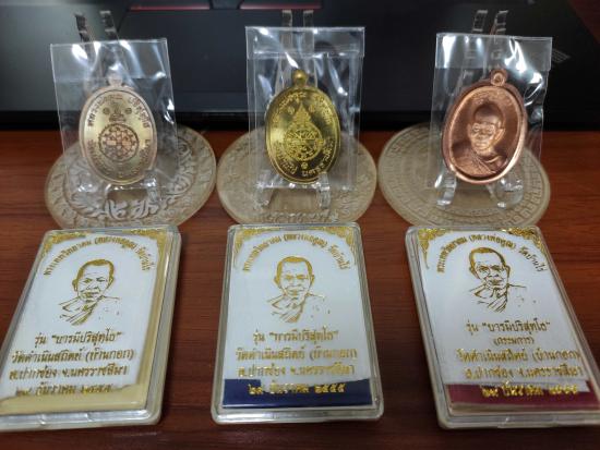 รายละเอียด 1.รุ่น บารมีปริสุทโธ ปี 2555 (จัดสร้างโดย วัดบ้านกอก ) เนื้อทองแดงผิวไฟ ไม่ตัดปีก หลังแบบ โค๊ด ๙ รอบ หมายเลข 151