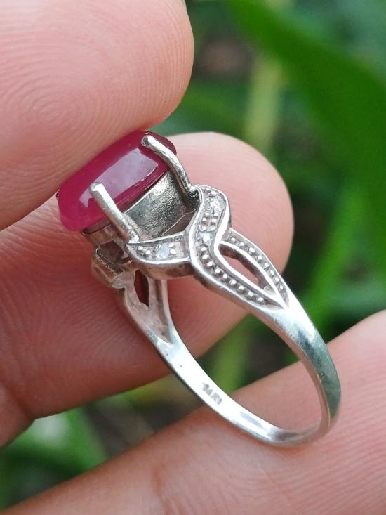 แหวนทรงโบราณมือ2 หัวทับทิม ด้านข้างมีเพชรด้านละ3เม็ดผมไม่แน่ใจเพชรซีกแท้มั้ย ตัวเรือนเป็นเงินแท้ชุบเคลือผิว แต่ตีตรา14KT นน.ตามภาพเลยครับ |