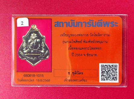 เหรียญหลวงพ่อกวย ชุตินธโร รุ่นรวมใจศิษย์ เนื้อกะไหล่ทอง หลังหนุมาน ปี 2564 บัตรรับรองG พระ
