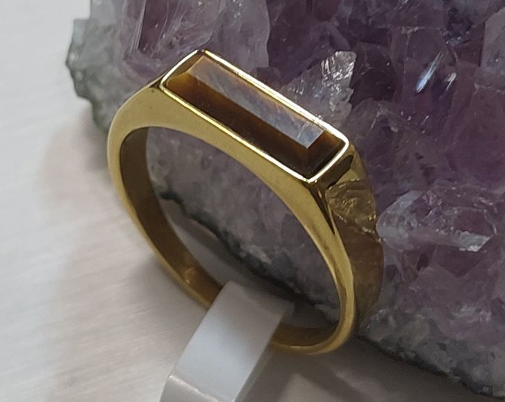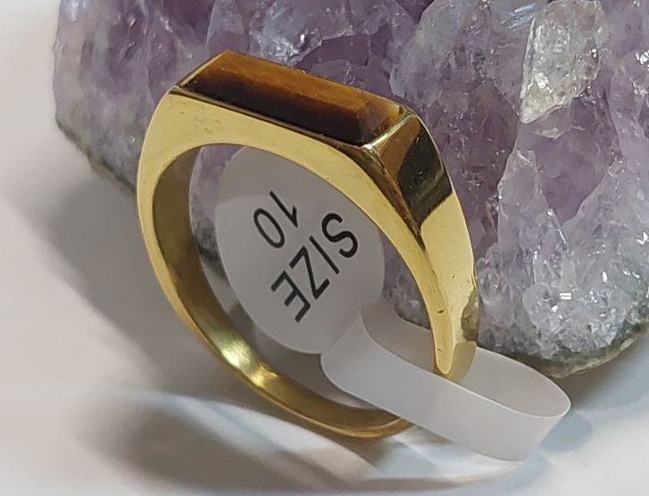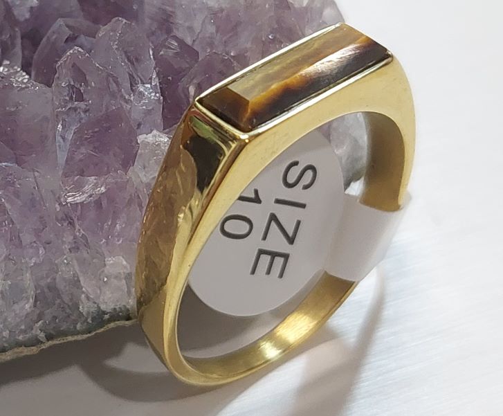 แหวนหัวไทเกอร์อายหรือหินตาเสือ ตัวเรือนแหวนเป็นสแตนเลสงานเลเซอร์ทองแข็งแรงทนทาน ขนาดแหวนเบอร์10 |
