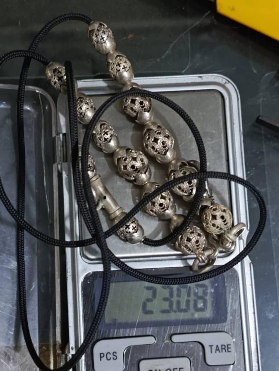 สร้อยเม็ดเงินแท้เก่า สั่งทำ ยาว 36 นิ้วสวมหัวได้ หนัก 23 กรัมกว่า สวยสมบูรณ์ แขวงพระด้านหลังได้