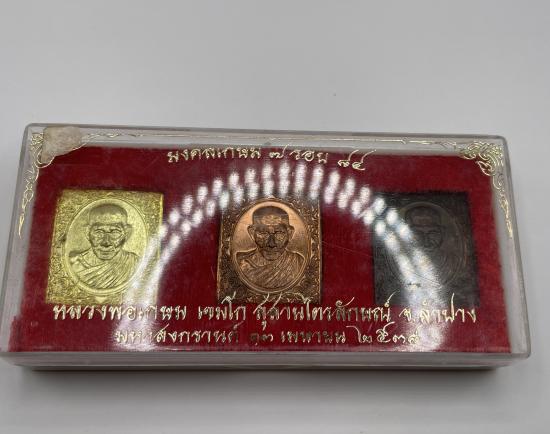 เคาะเดียวแดง เหรียญแสตมป์ รุ่น มงคลเกษม7รอบ ปี 38 ประกอบด้วย เนื้อนวะโลหะ เนื้อทองเหลือง และเนื้อทองแดง พร้อมกล่อง |