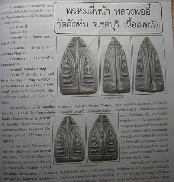 พระพรหมสี่หน้า หลวงพ่ออี๋ วัดสัตหีบ จ.ชลบุรี เนื้อเมฆพัตร พุทธคุณเด่นทางด้าน เมตตามหานิยม, เสริมเรื่องการงานการเงิน, ค้าขายร่ำรวย, คุ้มครองป้องกัน น่าเก็บสะสมมากๆ เหมาะมากหากนำไปใส่ติดตัวหรือเก็บไว้ที่บ้าน เพื่อความสุข ความเจริญ กับผู้เป็นเจ้าของ พระครูวรเวทมุนี (หลวงพ่ออี๋) จังหวัดชลบุรี ได้สร้างพระเครื่องรางต่างๆ ไว้มาก รวมทั้งปลัดขิกที่มีชื่อมาก (พอๆ กับหลวงพ่อเหลือ แปดริ้ว) ทั้งตะกรุด เสื้อยันต์ เหรียญ พระปิดตา "พระสาม" และ "พระสี่" (พรหมสี่หน้า) กล่าวกันว่าในระยะ พ.ศ. 2483-86 นั้น หลวงพ่ออี๋ ก็มีของดีเกรียงไกรออกสู่สงครามอินโดจีนไปก็มาก ชื่อเสียงของท่านดังขนานไปกับหลวงพ่อจาด วัดบางกระเบา และหลวงพ่อจง วัดหน้าต่างนอกทีเดียว พระเครื่องรางของขลังของหลวงพ่ออี๋ มีสร้างออกมามากแบบเอาใน พ.ศ. 2484 และตาม พ.ศ. นี้เอง "พระสาม" และ "พระสี่" หรือ พระพรหมสี่หน้า ก็ได้กำเนิดตามออกมาด้วย พระทั้ง 2 พิมพ์เป็นพระเนื้อเมฆพัตร ด้านพุทธคุณมีทั้งแคล้วคลาด และคงกระพันชาตรี พระพรหมสามหน้าของหลวงพ่ออี๋ เป็นเนื้อเมฆพัตร สร้างราวๆ ประมาณช่วงปี พ.ศ. 2483-2485 ทันยุคสมัยของหลวงพ่ออี๋ท่าน เป็นรูปพระปางสมาธิ ซึ่งรุ่นนี้ช่างได้สร้างออกมาเป็นครั้งแรก สร้างเป็น 3 หน้า หรือ 3 ด้าน แต่สร้างผิด คือ ไม่เป็นไปตามเจตนารมณ์ของหลวงพ่ออี๋ ตามประสงค์ที่แท้จริงที่ถูกต้องของท่าน ท่านต้องการพระพรหม 4 หน้า ต่อมาจึงได้สร้างให้ถูกต้องตามประสงค์ แล้วก็นำเข้าพิธีพุทธาภิเศกพร้อมกันทั้ง พระพรหม 3 หน้า และ 4 หน้า นับว่าเป็นเครื่องรางของขลังอีกประเภทที่ทันหลวงพ่ออี๋ปลุกเสก