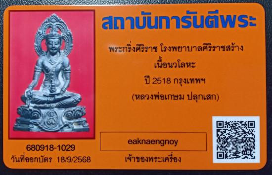พระกริ่งศิริราช เนื้อนวโลหะ ปี 2518 หลวงพ่อเกษมปลุกเสก องค์นี้สภาพสวยมากครับ ไม่ผ่านการใช้งานเดิมๆหล่อมีหน้ามีตาจมูกโด่งๆ คราบขี้เบ้าเดิมๆกริ่งดังกังวาลเลยครับองค์นี้ ฟอร์มแชมป์เลยครับ ส่งประกวดมีรางวัลติดมือกลับบ้านแน่นอนครับ มาพร้อมบัตรรับรองครับ นำไปเลี่ยมทองโชว์ได้ไม่อายใครครับ ผู้มีเงินเย็นถือเก็บยาวๆกันได้เลยครับ สนใจก็เชิญร่วมประมูลกันได้ครับ ผมรับประกันความแท้ครับ เก๊ยินดีคืนเงินเต็มครับ