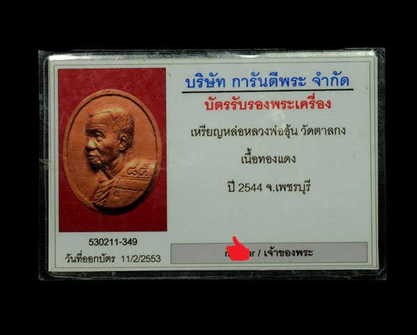 <>> เหรียญหล่อหันข้าง หลวงพ่ออุ้น วัดตาลกง อายุ85 ปี พ.ศ. 2544 เลี่ยมกันน้ำ เข้ากรอบเงิน พร้อมบัตร <>>