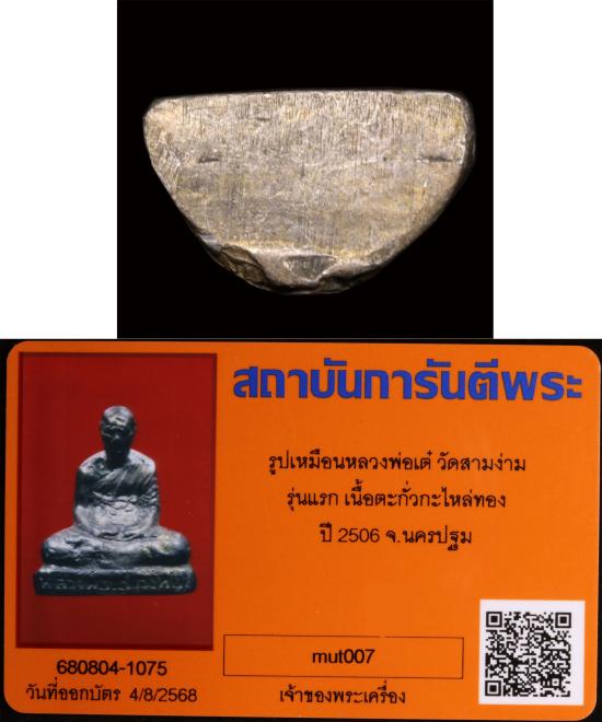 รูปเหมือนหลวงพ่อเต๋ วัดสามง่าม รุ่นแรก เนื้อตะกั่วกะไหล่ทอง ปี 2506 จ.นครปฐม (พร้อมบัตรรับรองพระเครื่อง)
