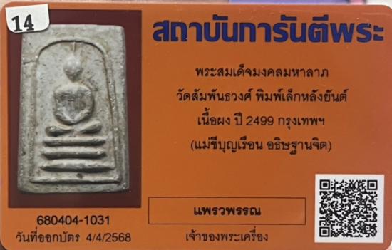 พระมงคลมหาลาภพระสมเด็จพิมพ์เล็กเนื้อผงพรหมโสฬรปี2499.คุณแม่บุญเรือน