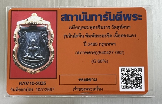 เหรียญชินราช อินโดจีน 2485 เลี่ยมทอง บัตรสภาพสวย
