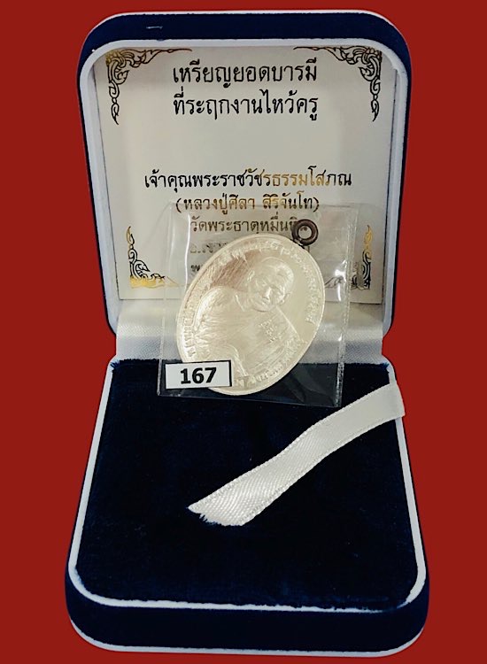 หลวงปู่มหาศิลา ยอดบารมี เนื้อเงิน ผิวกระจกวิ้งๆ จมูกโด่ง เลข167กล่องเดิม พระสวยนิยม