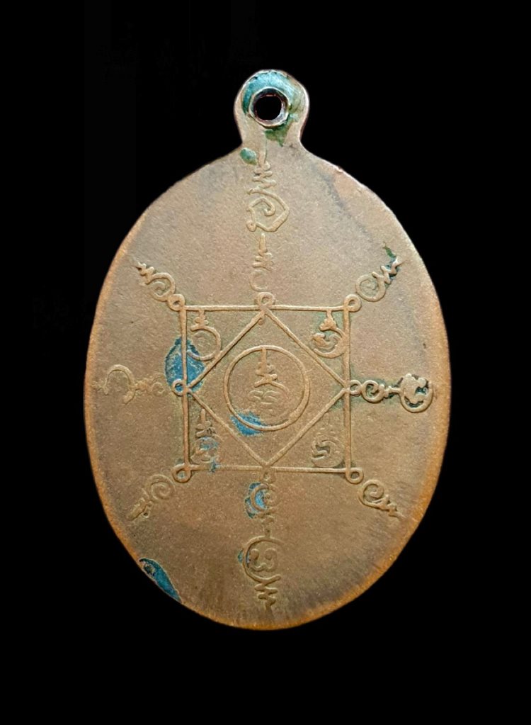 ด้านข้าง ไม่มียันต์ตัวอุณาโลม ในกรอบยันต์ข้าวหลามตัด เหรียญนี้สภาพใช้มาเล็กน้อยยังพอสวยครับ