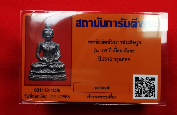 พระชัยวัฒน์นิรันตราย วัดราชประดิษฐ์ เนื้อนวโลหะ ปี 2515 หลวงปู่ทิมปลุกเสก จัดสร้าง 999 องค์พร้อมบัตรรับรอง |