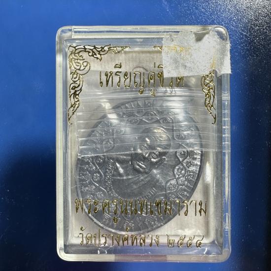 เหรียญคู่ชีวิต เนื้อตะกั่ว หลวงปู่หยุด วัดปรางค์หลวง จ.นนทบุรี ปี 2554