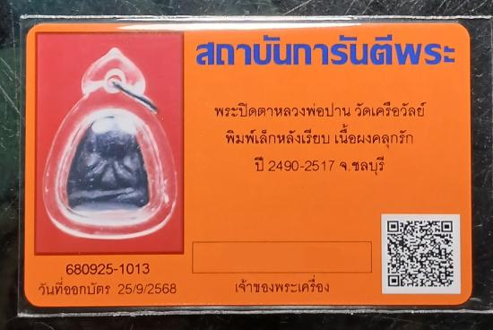 เคาะเดียวเบาๆ...ปิดตาหลวงพ่อปาน วัดเครือวัลย์ ชลบุรี พิมพ์เล็ก เนื้อผงคลุกรัก (หายาก) ปี 2490-2517 พระสวยครับ พร้อมบัตรรับรองจากทางเว็บ |