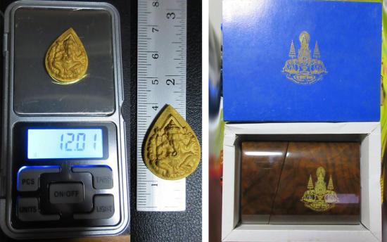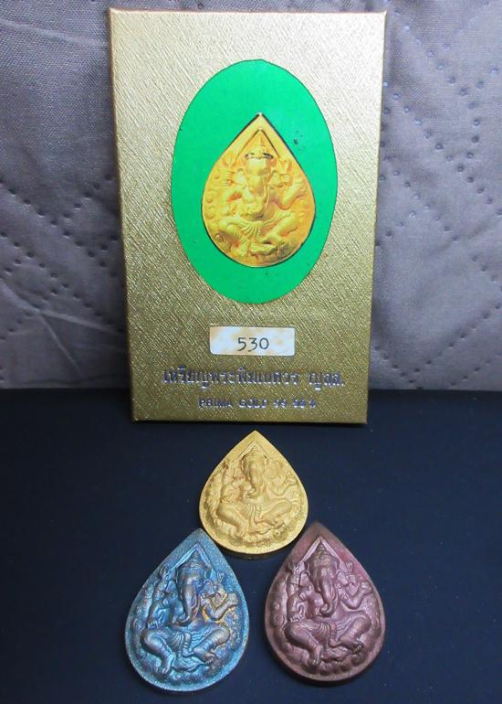 พระพิฆเนศวร ชุดเนื้อทองคำพิมพ์ใหญ่ (นน. 12.01 กรัม) เงิน ทองทิพย์ ด้านหลัง ญสส. พร้อมการ์ด และกล่องไม้ หมายเลข 530