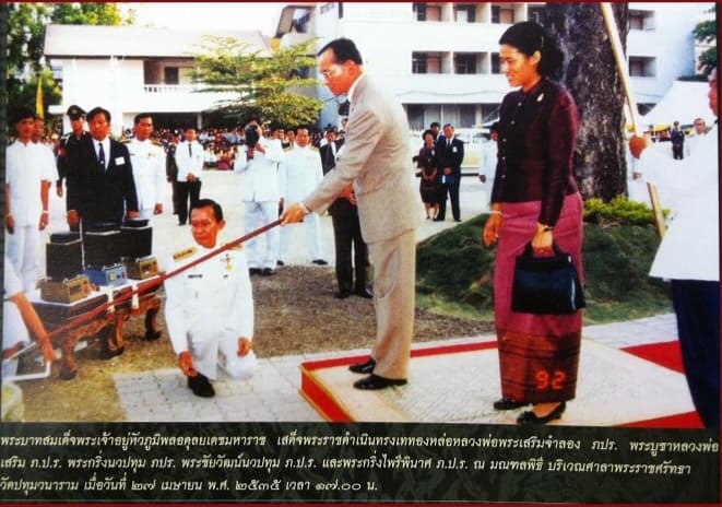 "วันพฤหัสบดีที่ ๒๓ เมษายน พ.ศ. ๒๕๓๕ อันเป็นเวลาก่อนที่ล้นเกล้าฯ พระบาทสมเด็จพระเจ้าอยู่หัวภูมิพลอดุลยเดชมหาราช เสด็จพระราชดำเนินทรงประกอบพิธีเททองในเวลา ๑๗.๐๐ น. จำแนกเป็นทองคำบริสุทธิ์ ๑๐๐% คิดเป็นน้ำหนัก ๑๒๕.๒ บาท ทองคำชนิดบริสุทธิ์ ๙๐% คิดป็นน้ำหนัก ๒๙.๔ บาท และทองเค (๒๘ k) คิดเป็นน้ำหนัก ๒๖.๖ บาท จึงนับว่า หลวงพ่อพระเสริม ภ.ป.ร. มีส่วนผสมที่เป็น ทองคำ ซึ่งมีความบริสุทธิ์เป็นเปอร์เซ็นต์สูงมาก นอกจากนี้ยังมีผู้มีจิตศรัทธานำ เงินบริสุทธิ์, ทองแดง, ทองเหลือง, ขันลงหิน อีกเป็นจำนวนมากมาร่วมหล่อเป็นองค์ หลวงพ่อพระเสริม ภปร. ที่แสดงให้เห็นถึงการ ไม่แบ่งแยกชนชั้น ไม่ว่าจะยากดีมีจนทุกคนมีสิทธิได้ร่วม โดยเสด็จพระราชกุศล สร้างพระพุทธปฏิมา หลวงพ่อพระเสริม ภปร. เป็นพระประธานประจำ ศาลาพระราชศรัทธา ทางด้านการจัดพิธีมหาพุทธาภิเษกท่านเจ้าพระคุณ สมเด็จพระญาณสังวรสมเด็จพระสังฆราชสกลมหาสังฆปรินายก เสด็จเป็นองค์ประธานในพิธีเบิกพระเนตรพระพุทธปฏิมา หลวงพ่อพระเสริม ภปร. ภายหลังจากช่างได้ทำการตกแต่งเสร็จแล้วนับตั้งแต่ล้นเกล้าฯ พระบาทสมเด็จพระเจ้าอยู่หัวภูมิพลอดุลยเดชมหาราช ทรงมีพระมหากรุณาธิคุณเสด็จพระราชดำเนินทรงประกอบพิธีเททองเมื่อวันที่ ๒๓ เมษายน พ.ศ. ๒๕๓๕ แล้ว ในครั้งนี้คณะกรรมการได้จัดให้มีการประกอบพิธีมหาพุทธาภิเษกหลวงพ่อพระเสริม ภปร.พระพุทธปฏิมาเป็นพระประธานประจำศาลาพระราชศรัทธาแล้วยังประกอบด้วย หลวงพ่อพระเสริม ภปร. ขนาดบูชา ๙ นิ้ว ๕ ฟุต พระกริ่งนวปทุม ภปร., พระชัยวัฒน์นวปทุม ภปร., พระกริ่งไพรีพินาศ ภปร., พระผงหลวงพ่อพระเสริม ภปร. และพิธีชัยมังคลาภิเษกเหรียญพระรูปเหมือน พระอุบาลีคุณูปมาจารย์ (จันทร์ สิริจันโท) ภปร.