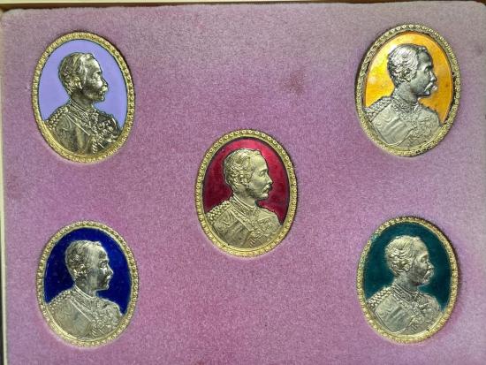 200.- ems เหรียญเสด็จพ่อ ร.๕ วัดสุทัศน์ (พิธีใหญ่ เสกในพระอุโบสถ 3 วัน 3 คืน) กะไหล่ทองลงยา กรรมการ 1 ใน 1555 ชุด (5 สี-5 เหรียญ) สมโภชน์พระอาราม 200 ปี ตอกโค๊ด สวยเดิมๆ กล่องเดิมจากวัด