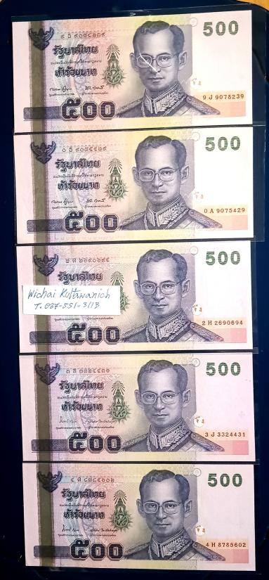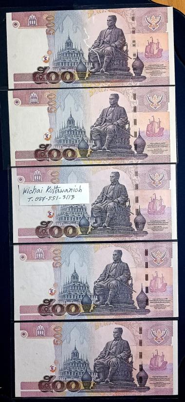 ธนบัตร 500 บาท ร.9 แบบ 15 จำนวน 5 ใบ ไม่ผ่านใช้ 4 ใบ ผ่านใช้น้อย 1 ใบ มีเลข 9หน้า-9หลัง 2 ใบในชุด ราคาเบาหวิว
