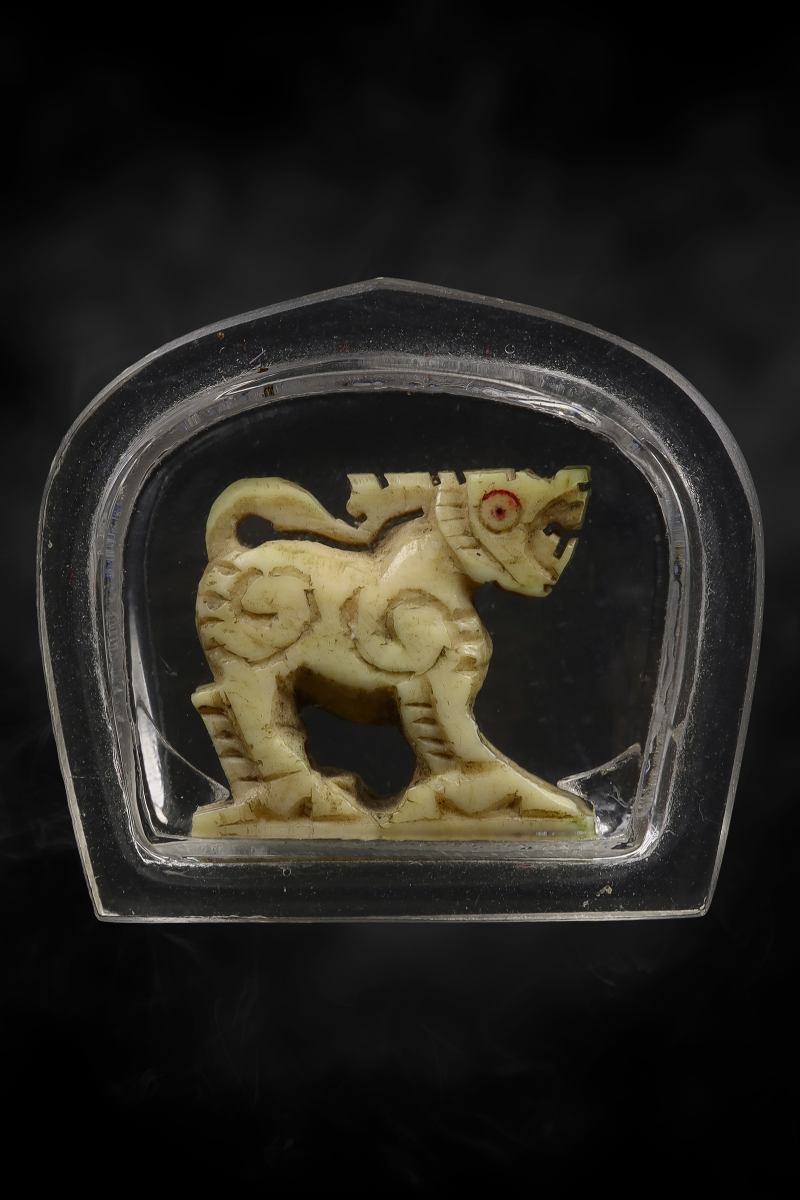 สิงห์งาแกะ หลวงพ่อมุ่ย วัดดอนไร่ ศิลป์คอม้า สองขวัญเลข ๑ ไม่หัก ไม่ซ่อม ขนาด ๑.๕ ซม. อยู่ในเลี่ยมกันน้ำ