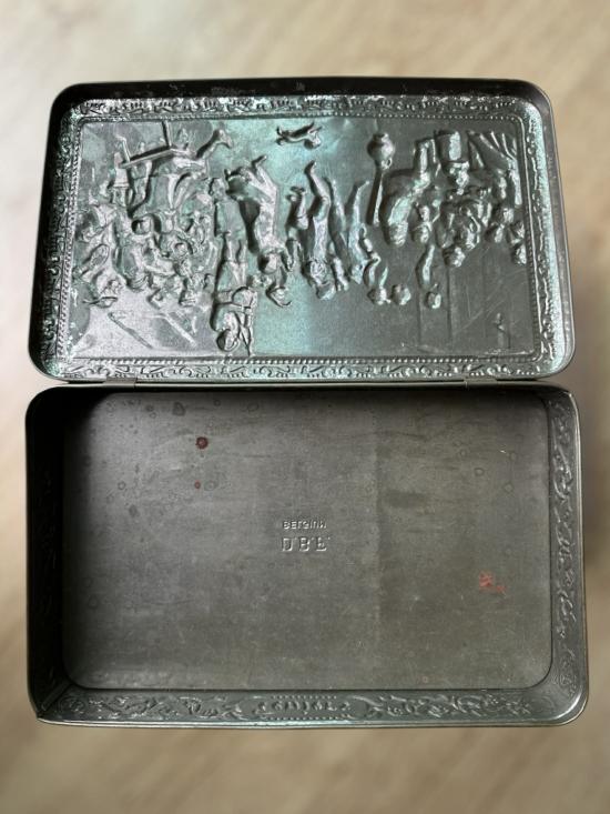 กล่องบิสกิต โบราณ teniers ลายนูน ปี 24XX ฝรั่งเล่นกันพัน+ ขนาด 20 x 32.5 ซม สูง 6 ซม |
