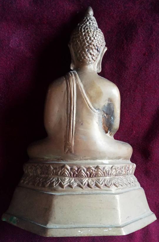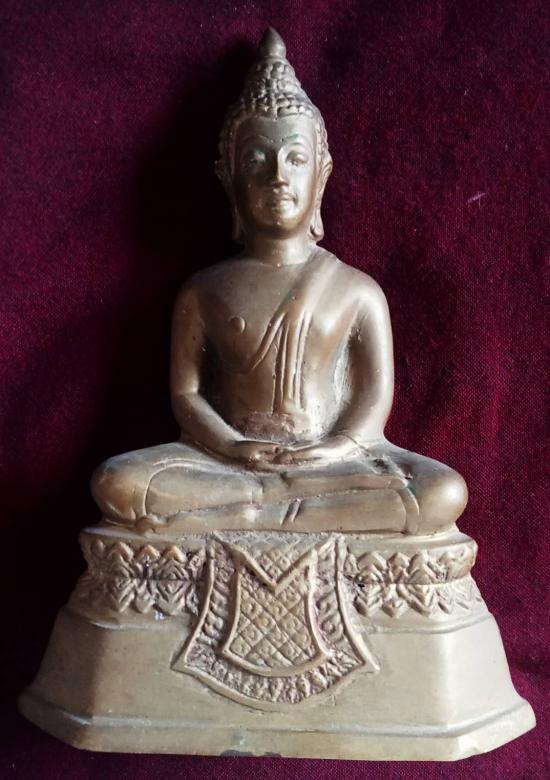 พระบูชา ปางตรัสรู้ ขนาดหน้าตักประมาณ 3.5 นิ้ว ประทับนั่งบนผ้าทิพย์ ฐานบัวฟันปลาคว่ำบัวหงายงาม ๆ เนื้อทองเหลือง สีเริ่มออกคล้ำ ใต้ฐานดินไทยวรรณสองสี สภาพสวยตามรูป ส่งฟรีทั่วไทย รับประกันตามกฎครับ |
