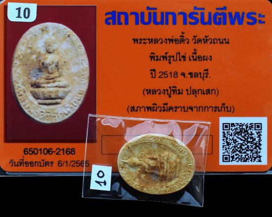 ( 10 ) พระหลวงพ่อติ้ว วัดหัวถนน พิมพ์รูปไข่ เนื้อผง ปี 2518 จ.ชลบุรี (หลวงปู่ทิม ปลุกเสก) + บัตรรับรองพระแท้การันตีพระ |