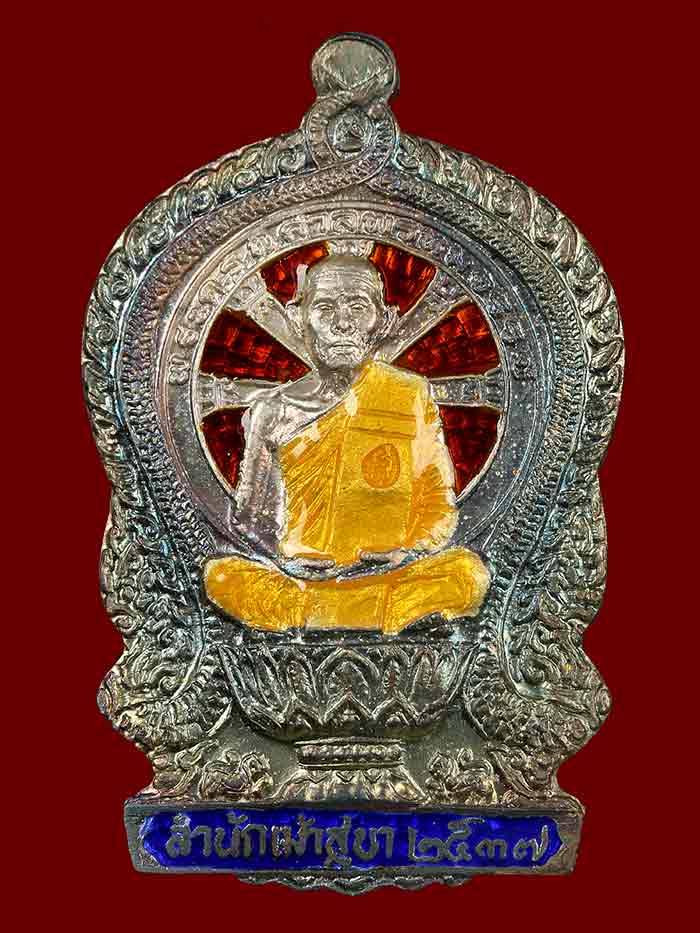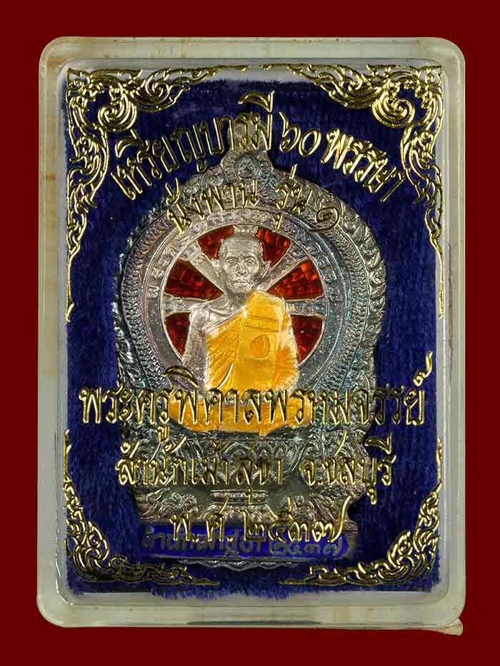วัดใจ เหรียญนั่งพานรุ่นแรก หลวงพ่อสวัสดิ์ วัดเม้าสุขา เนื้อเงินลงยา ปี37 สภาพสวยเดิมตากล่อง เลข19