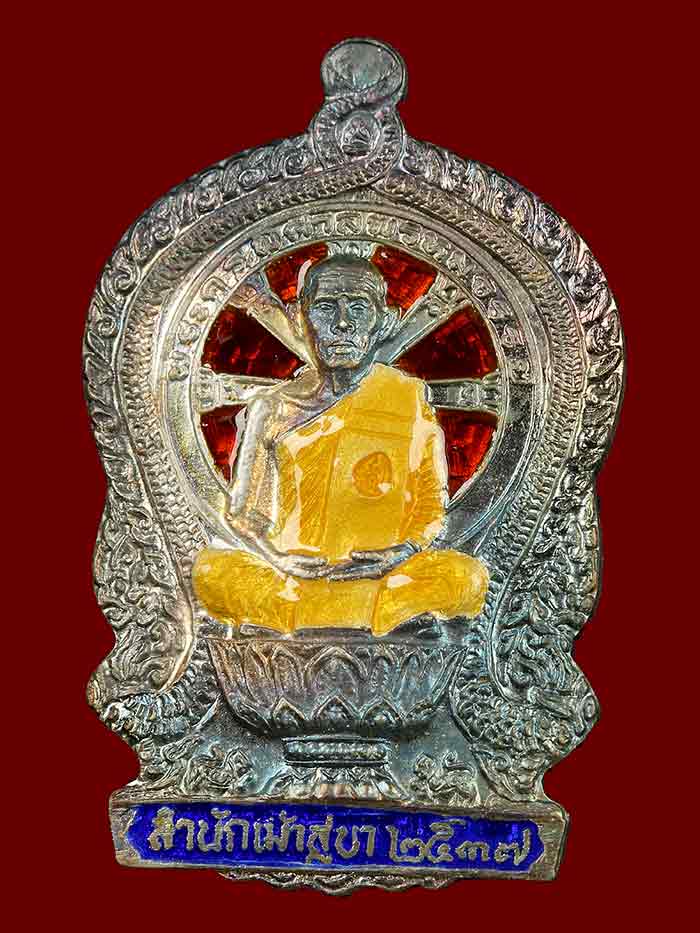 วัดใจ เหรียญนั่งพานรุ่นแรก หลวงพ่อสวัสดิ์ วัดเม้าสุขา เนื้อเงินลงยา ปี37 สภาพสวยเดิมตากล่อง เลข84