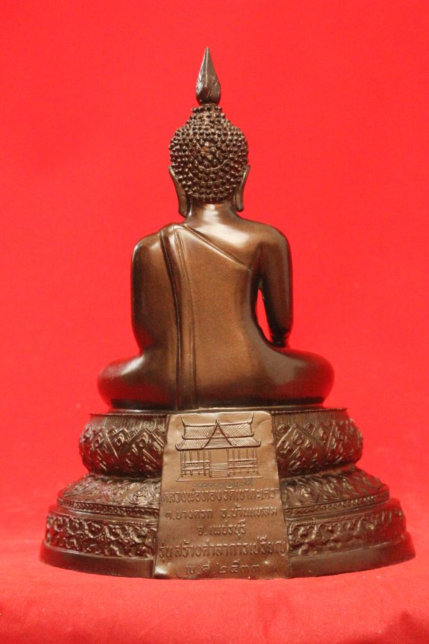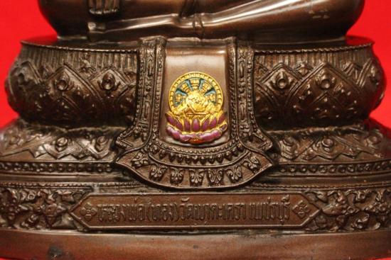 ที่ด้านหน้ามีแผ่นเพลทโลหะ ชื่อหลวงพ่อพร้อมวัดและจังหวัด ส่วนด้านบนที่ฐานผ้าทิพย์ มีตราวัดเขาตะเครา ที่ตราวัดมีลงยาสี ไม่ลอกไม่ร่อนสมบูรณ์และสวยครับสีติดครบทุกสี