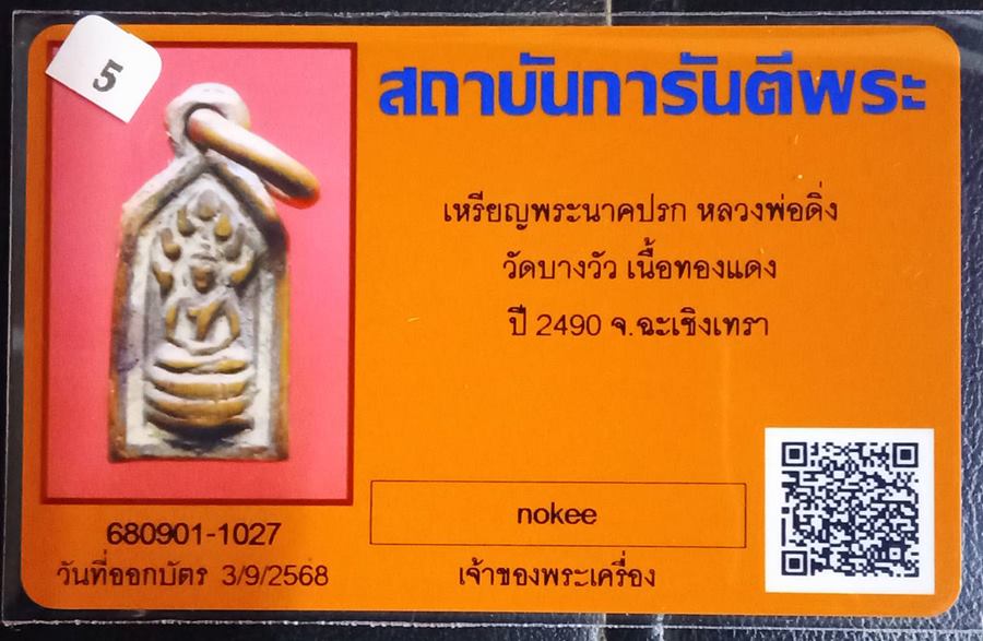 "เหรียญพระนาคปรก หลวงพ่อดิ่ง วัดบางวัว เนื้อทองแดง ปี 2490 จ.ฉะเชิงเทรา+บัตรรับรองการันตีพระ(สภาพสวยผิวเดิมๆครับ)"