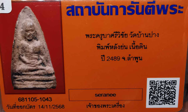 พระครูบาศรีวิชัย วัดบ้านปาง พิมพ์หลังย่น เนื้อดิน ปี2489 จ.ลำพูน + บัตรG-pra สภาพเดิมค่ะ |