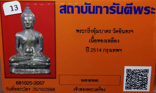 พระกริ่งอุ้มบาตร วัดอินทรฯ เนื้อทองเหลือง ปี2514 กทม. + บัตรG-pra สภาพเดิมค่ะ |