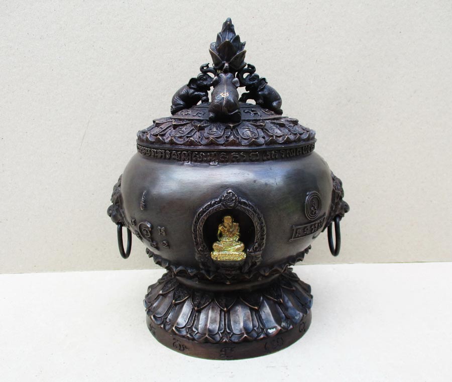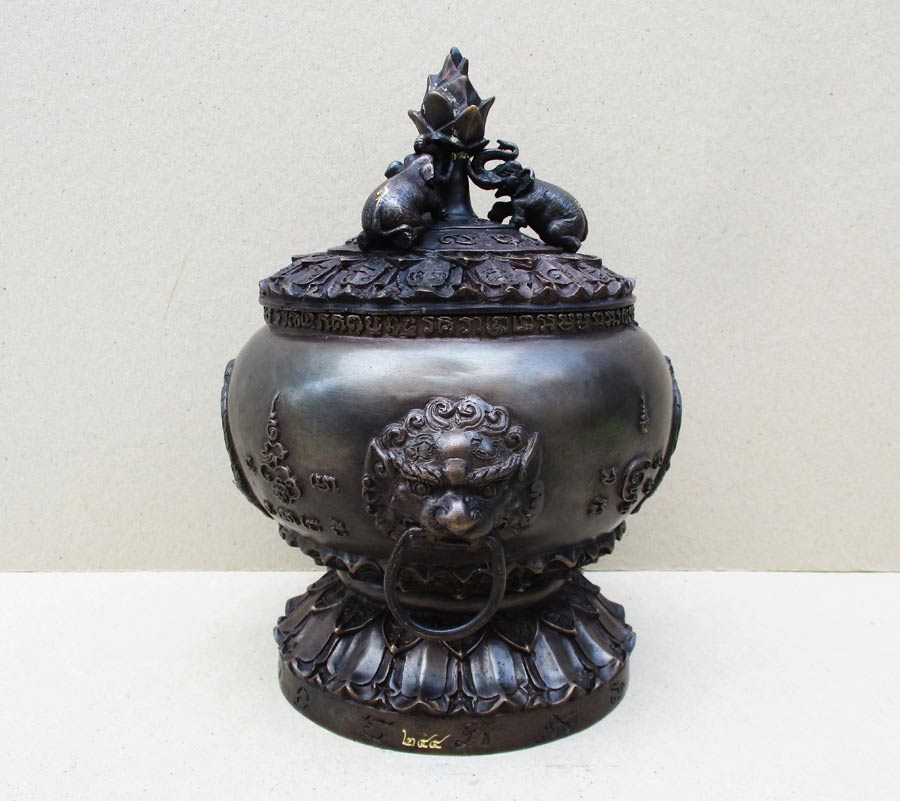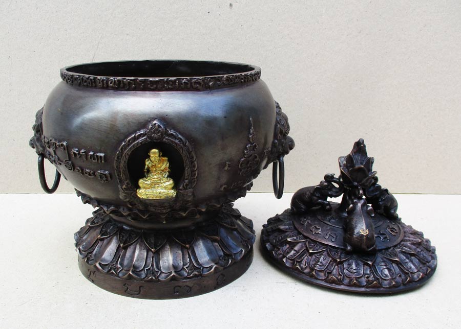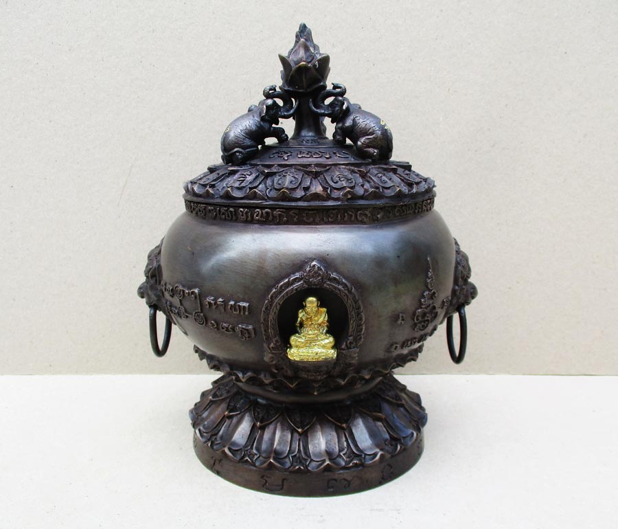 บาตรน้ำมนต์มีฝาครอบ พ่อท่านพรหม ขันติโก วัดบ้านสวน อ.ควนขนุน จ.พัทลุง รุ่นโพธิสัตโต พ.ศ.2557 เนื้อโลหะรมมันปู ด้านในเคลื อบด้วยขี้ผึ้ง สภาพสวยยังไม่เคยใช้ !!