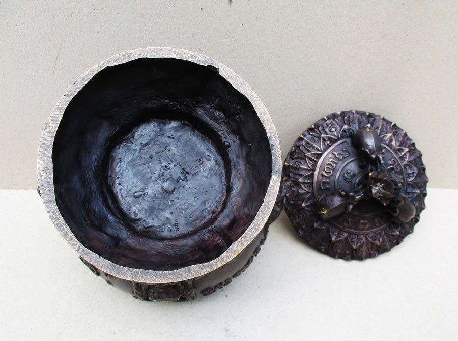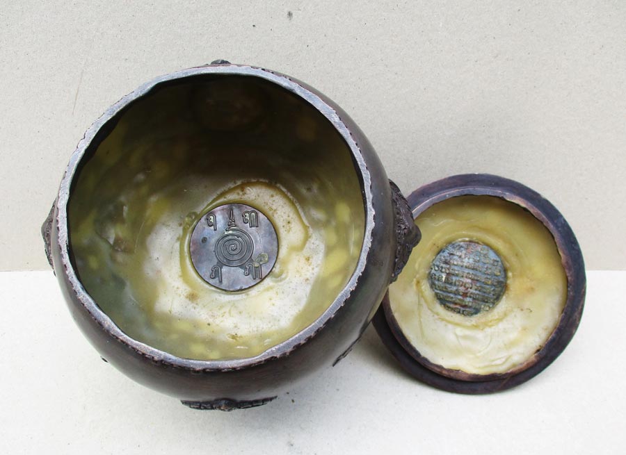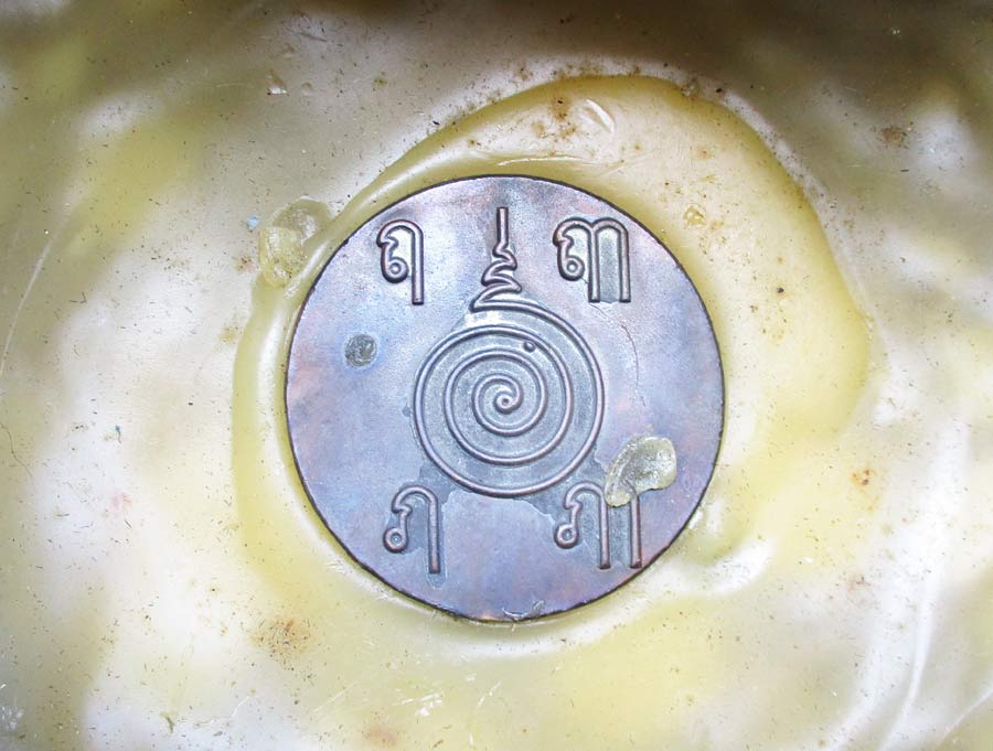 เนื้อโลหะรมมันปู ด้านในเคลือบด้วยขี้ผึ้ง สภาพสวย สมบูรณ์ ยังไม่เคยใช้บรรจุน้ำพระพุทธมนต์ !!