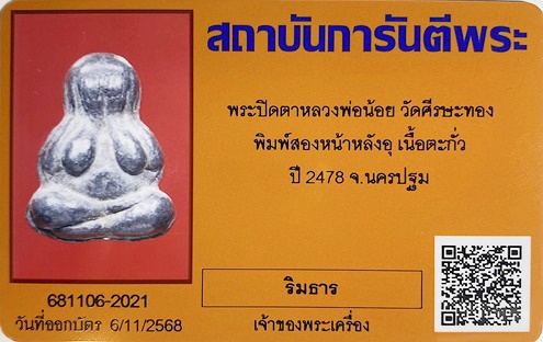 พระปิตตาหลวงพ่อน้อย วัดศรีษะทอง พิมพ์สองหน้าหลังอุ เนื้อตะกั่ว ปี2478 มีบัตรรับรองจีพระ เคาะเดียว |