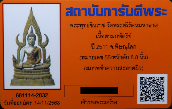 พระบูชา พระพุทธชินราช ปี 2511 วัดพระศรีรัตนมหาธาตุ เนื้อ 3กษัตริย์ จ.พิษณุโลก ขนาดหน้าตัก 9 นิ้ว หมายเลขมงคลประจำองค์ 55 + บัตรรับรอง G-PRA