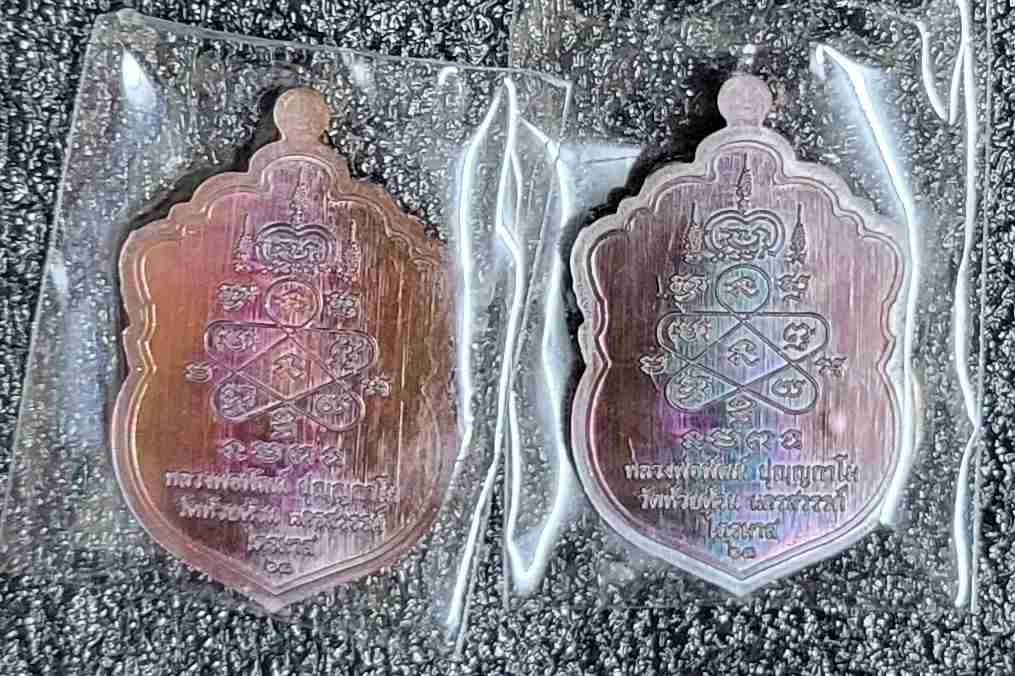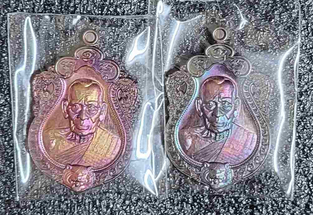 เคาะเดียวแดง เหรียญหลวงพ่อพัฒน์ รุ่นไตรมาส 63 พิมพ์เสมาคาบแก้ว เนื้อทองแดงผิวรุ้ง รวม 2 เหรียญ |
