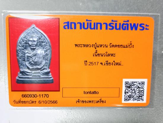 เหรียญหล่อรูปเหมือน พิมพ์ใบเสมา ปี 2517 หลวงปู่แหวน สุจิณฺโณ เนื้อนวโลหะ พร้อมบัตรG