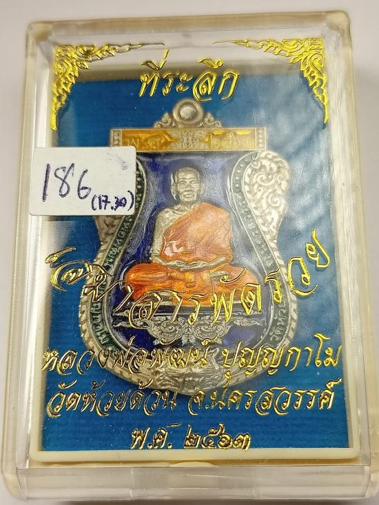 186 เลขสวย เหรียญเสมา "สารพัดรวย" หลวงพ่อพัฒน์ วัดห้วยด้วน เนื้อเงิน ลงยาขุ้ยพื้นสีน้ำเงิน (น้ำหนัก 17.30กรัม) เบอร์ 186 พร้อมกล่องครับ
